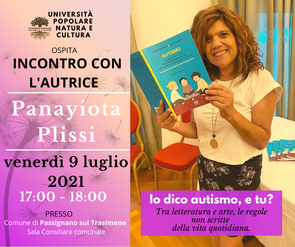 Incontro con l’autrice Panayiota Plissi che parlerà della sua esperienza personale nell’ambito dello spettro autistico e dei suoi libri Non sono un mostro, ti dico! e Autismo. Le regole non scritte del comportamento sociale per bambini e ragazzi 4-12 anni (edizioni Anicia).